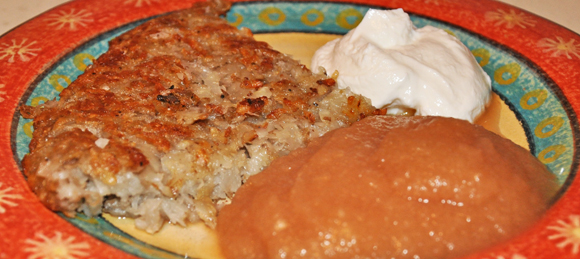 Earthy potato pancake, crunchy on the outside, creamy and melting on the inside. Sweet, smooth, fragrant applesauce. Tart, creamy yogurt. So simple, so basic, so luscious and satisfying. I could have this every day for a week. Dinner, lunch or breakfast.