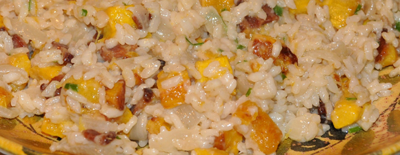 Luscious, creamy rice. Sweet squash and smoky pancetta roasting in the oven while you're stirring on the stovetop. Elegant and hearty for the first almost-cold night of Fall.