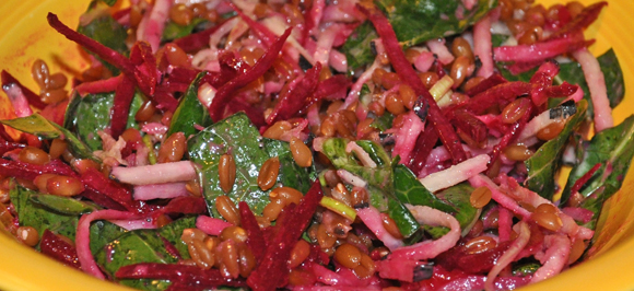 This Fall's perfect all-in-one whole grain and seasonal vegetable salad. Loads of Vitamins A and C. Protein, too. Light, bright mustard-lemon dressing is great with the sweet beets and sharp radish. And it rubs off very well on the rich, nutty farro.