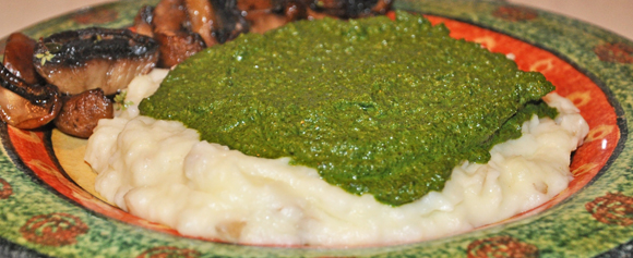 Swiss Chard. At Farmers Markets everywhere. Beautiful, flavorful, healthful. An abundant supply. Prices are low. Because, well, there's no big demand for this under appreciated leafy green. Here's the trick to change that: Chard Puree on Mashed Potatoes.
